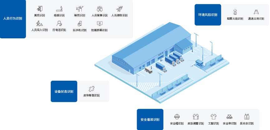 通過(guò)智能視頻分析系統(tǒng),實(shí)時(shí)對(duì)信息進(jìn)行智能化分析和展示,對(duì)監(jiān)管員工異常行為、設(shè)備異常及時(shí)做出響應(yīng),合理充分對(duì)人員、設(shè)備有效管理、進(jìn)而實(shí)現(xiàn)生產(chǎn)效率的提升。