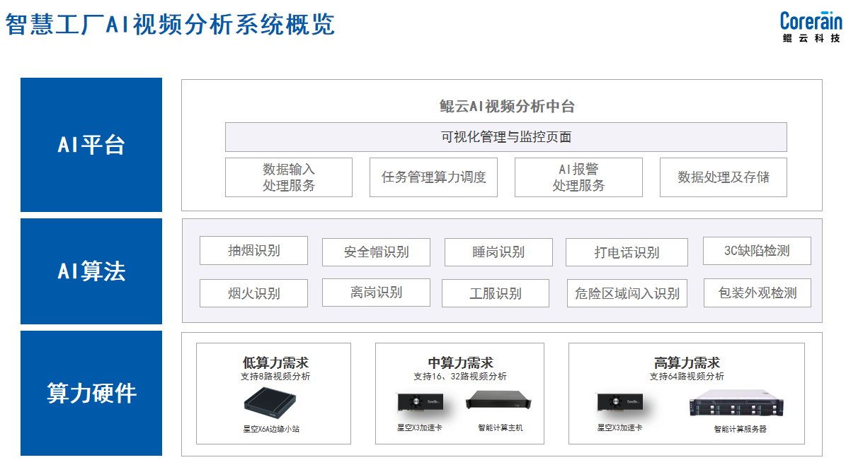 傳統(tǒng)工廠正處于向智慧工廠建設(shè)的關(guān)鍵階段,亟需采用融合智能化和信息化的技術(shù),來(lái)推動(dòng)生產(chǎn)管理模式從局部、粗放、低效向安全、精準(zhǔn)、高效方向變革。鯤云科技提供算法算力平臺(tái)一體化的工廠安全生產(chǎn)解決方案,基于廠區(qū)/車(chē)間內(nèi)攝像頭采集的視頻圖像數(shù)據(jù),通過(guò)人工智能技術(shù)實(shí)時(shí)識(shí)別安全著裝規(guī)范、作業(yè)規(guī)范、設(shè)備狀態(tài)、環(huán)境安全等安全生產(chǎn)因素,及時(shí)將危險(xiǎn)事件反饋給安全管理人員,提高安全生產(chǎn)管理效率。在產(chǎn)品質(zhì)量標(biāo)準(zhǔn)方面,通過(guò)3C缺陷檢測(cè)、紡織缺陷檢測(cè)、包裝外觀檢測(cè)等AI識(shí)別對(duì)產(chǎn)品完好度實(shí)時(shí)監(jiān)測(cè),提升產(chǎn)品品質(zhì)。