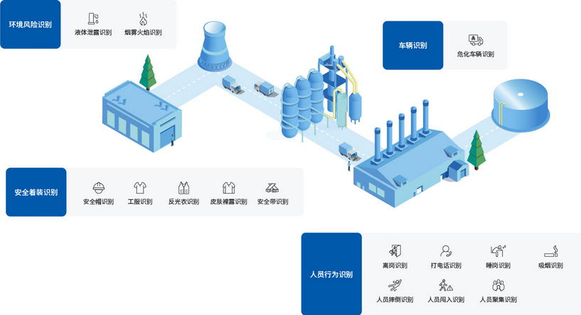要求化工園區升級企業安防系統建設智能分析平臺,通過AI視頻分析技術,匯聚視頻畫面信息,實現中控室、重大危險源現場等重點部位的視頻智能分析,支持實現火災、煙霧、人員違章(中控室脫崗)等進行全方位的識別和預警。