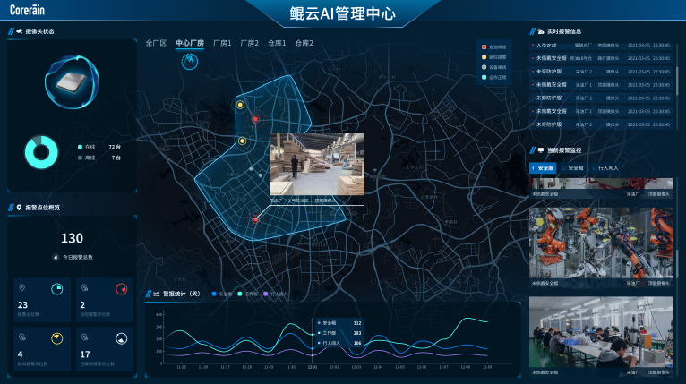 鯤云科技的智能視頻識別系統以實現傳統安監智能化升級為出發點,助力企業安全生產降本增效,已有超1000+用戶與鯤云攜手完成智能化轉型升級。鯤云科技基于傳統安防系統的層面上,將企業原有攝像頭接入部署多種AI算法的AI視頻分析盒子或AI邊緣服務器,可按照行業需求部署如:安全帽識別、煙霧火焰識別、吸煙識別、離崗識別等AI算法,實現工作面全場景異常識別監測,分析數據可傳輸到安全管理平臺和監測大屏,對安全異常實時秒級報警。鯤云智能視頻識別系統實現了高效率、低成本、規?;腁I創新和落地,賦予企業安防全面AI感知能力,通過自動化危險預警降低安全事故的發生率。