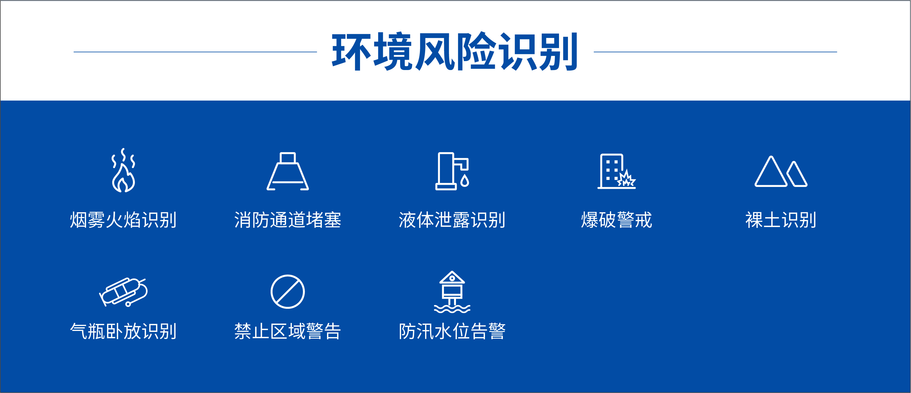 煙霧火焰識別、液體泄露識別、明火識別、裸土識別、車輛噴淋識別、桿塔倒伏識別、高壓隔離開關分合狀態識別、爆破警戒、消防通到堵塞、防汛水位告警等。