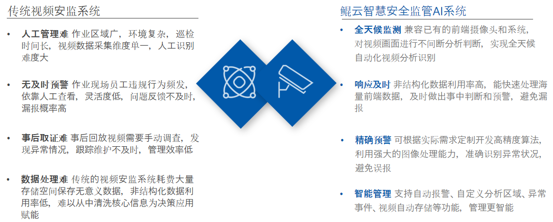 對(duì)比傳統(tǒng)視頻安監(jiān)系統(tǒng),鯤云智慧安全監(jiān)管AI平臺(tái)有以下幾點(diǎn)優(yōu)勢(shì):
