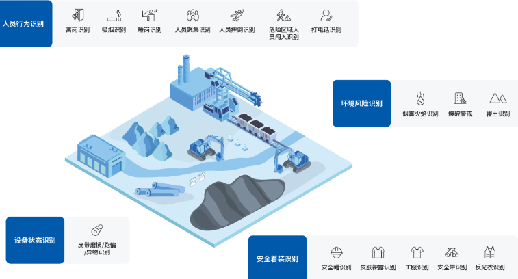 智慧礦山建設是礦山安全管理必經之路,為推進AI智慧礦山建設,鯤云科技推出了包含深入行業場景的AI算法、自主研發的AI算力產品和視頻分析平臺的智慧礦山管理系統。利用充分利舊的原則,將視頻分析設備與礦山井上井下各場景使用的攝像頭相連通過AI智能分析技術對攝像頭采集的視頻數據進行識別,識別分析視頻中的三違作業、主煤流運輸系統、輔助運輸系統中的異常風險,實時對地面和井下關鍵點位進行監測預警,助力礦業企業向智能化礦山轉型升級。