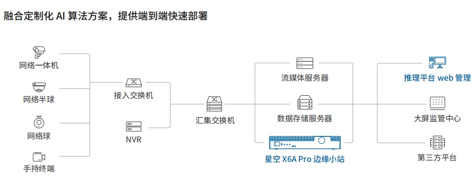 與傳統(tǒng)的監(jiān)測技術(shù)相比,AI識別盒子具有智能化的監(jiān)測功能。在盒子中部署相應(yīng)的行業(yè)AI算法,對攝像頭采集的視頻進(jìn)行識別分析, 可實現(xiàn)對視頻中的人、物、環(huán)境異常狀態(tài)的智能分析與識別,并在高達(dá)90%準(zhǔn)確率的AI算法作用下,減少了傳統(tǒng)人工監(jiān)管方式的錯誤率,提高監(jiān)測系統(tǒng)的效率和智能化水平。