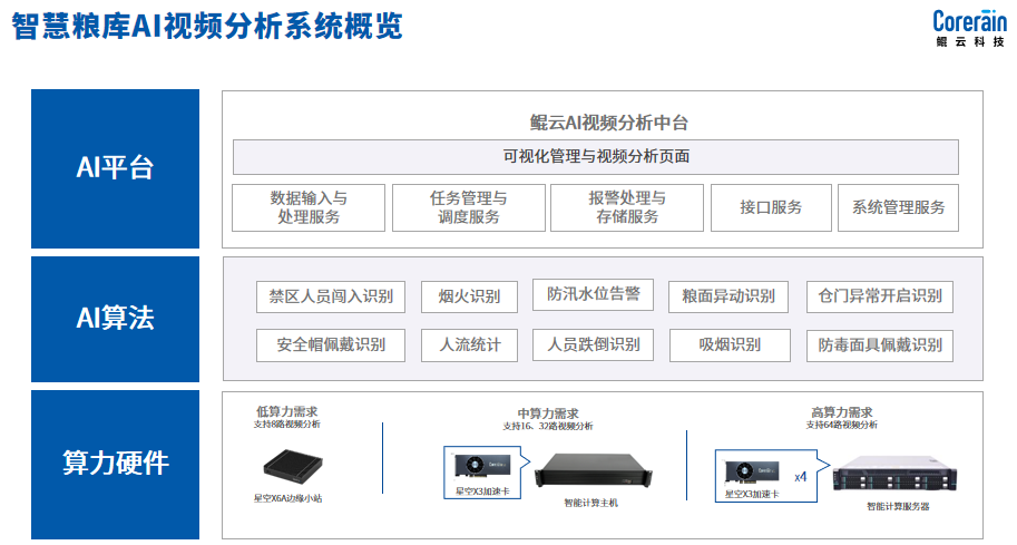 傳統的糧庫管理方式通常需要耗費大量的人力和物力資源,并且傳統糧庫管理存在許多問題,如人為差錯、信息不及時、計算精度低等,傳統的人工管理方式已經不能滿足糧庫管理的要求。為能夠有效地解決這些問題,鯤云科技在基于人工智能視覺基礎上,提供了自主研發的算力+算法+平臺一體化的糧庫智能化管理系統,通過引入人工智能技術,運用AI視頻分析降低人為差錯的發生幾率,還具備安全監測和報警功能,一旦發現異常情況,能夠立即報警并采取相應的應急措施,保障糧庫的安全運行。
