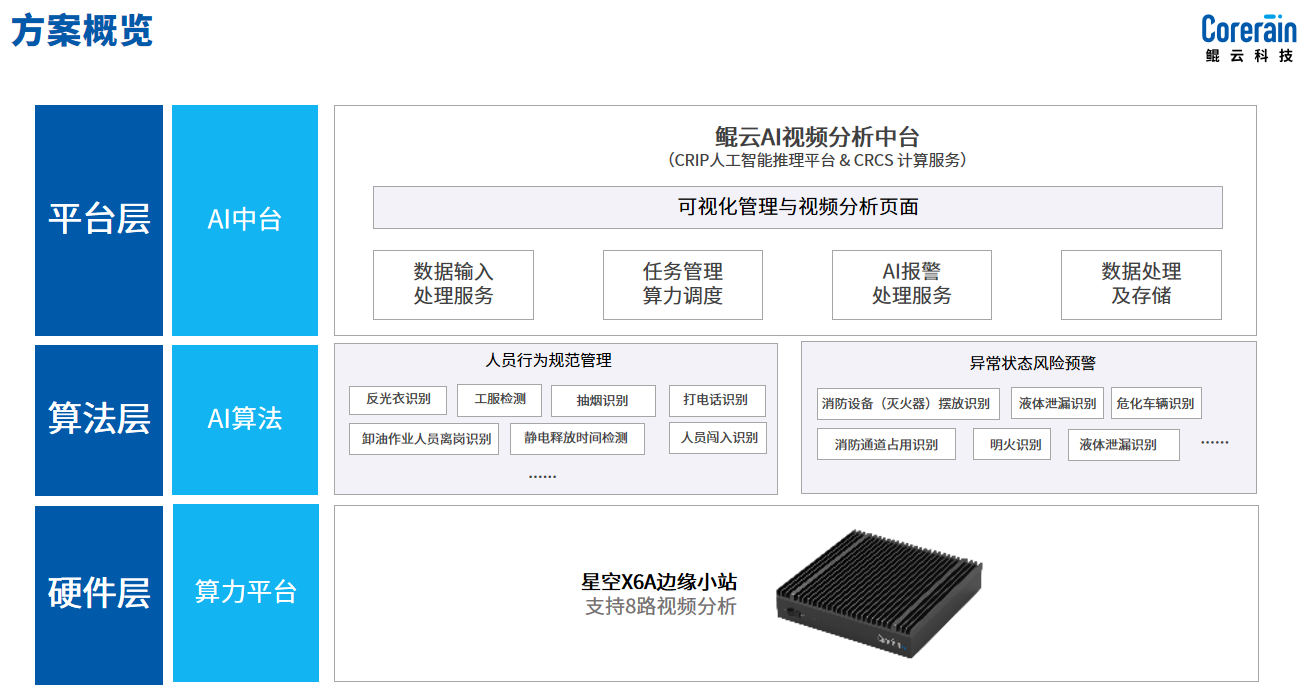 針對(duì)加油站安全事故頻發(fā)的問(wèn)題,鯤云科技為加油站提供算力算法平臺(tái)一體化智慧加油站解決方案,在加油站已有的監(jiān)測(cè)設(shè)備上部署帶有AI算法的視頻分析設(shè)備,助力傳統(tǒng)加油站升級(jí)成智能加油站AI監(jiān)測(cè)系統(tǒng)。采用視頻智能分析技術(shù),對(duì)加油區(qū)和卸油區(qū)內(nèi)人員抽煙、打電話(huà)等違規(guī)行為,明火和煙霧等異常狀態(tài),卸油作業(yè)時(shí)人員離崗、滅火器未正確擺放、靜電釋放時(shí)間不足等不規(guī)范情形進(jìn)行智能識(shí)別、報(bào)警和記錄,智慧加油站系統(tǒng)實(shí)現(xiàn)區(qū)域內(nèi)事前自動(dòng)報(bào)警,報(bào)警數(shù)據(jù)為監(jiān)管部門(mén)精準(zhǔn)施策提供依據(jù),助力加油站安全穩(wěn)定運(yùn)行。