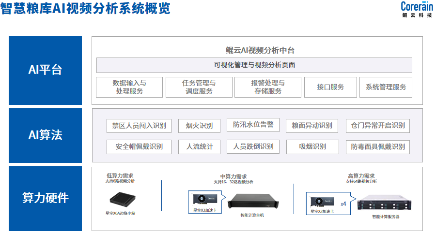 通過在糧庫原有前端攝像頭上安裝AI邊緣計算盒子,利用部署的倉內人數識別、倉門開關識別、糧面異動識別、煙霧火焰識別等AI算法,一旦發現糧食存儲過程中存在異常情況,系統會第一時間提醒管理人員采取相應措施,對糧庫實現可視化遠程監管,預防事故的發生。